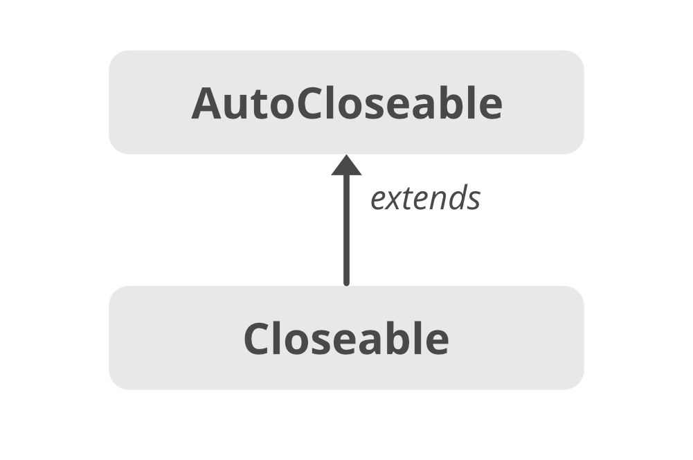 - 만약 Cloesable을 부모로 만들었다면 기존에 만들어준 클래스들이 모두 Cloesable이 아닌 AutoCloesable를 구현(implements) 하도록 수정이 필요했을 것이지만, 이러한 구조 덕분에 기존에 구현된 자원 클래스들 모두 try-with-resources가 사용가능해짐