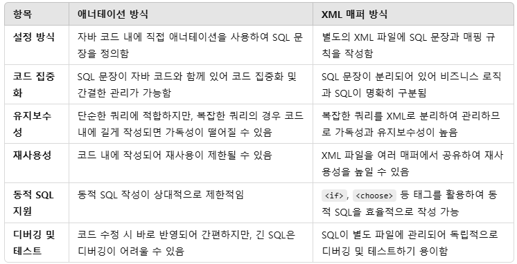 간단한 CRUD 작업이나 소규모 쿼리는 애너테이션 방식을, 복잡한 조인이나 동적 쿼리가 필요한 경우는 XML 매퍼 방식을 사용하는 것이 좋습니다. 프로젝트 규모와 팀의 유지보수 전략, 코드 가독성을 고려하여 적절한 방식을 선택해야 합니다.